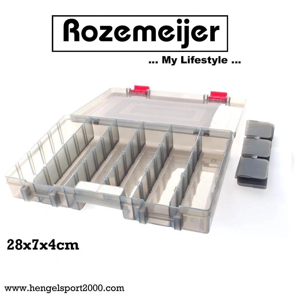 De Rozemeijer Tackle Tainers behoeven geen introductie. Al jaren voert Rozemeijer hoogwaardige kwaliteit Tackle boxes in de Tackle Tainers series. Deze S-series zijn de ondiepe versies. Door de donkere kleur wordt het UV licht gefilterd, zodat het kunstaas niet verbleekt. Uiteraard is de vak indeling naar eigen inzicht in te richten door middel van uitneembare schotjes. De Tackle Tainers zijn voorzien van uitstekende sluitingen en stevig kunststof.